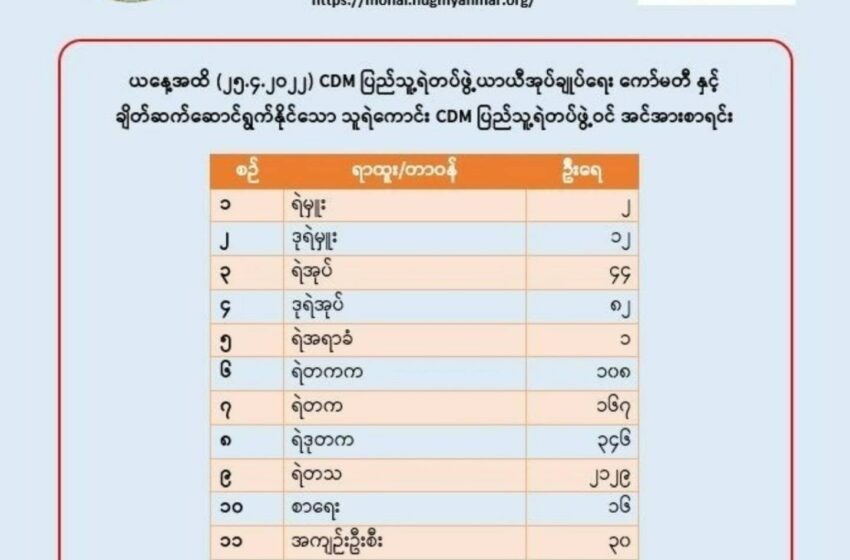 မြန်မာနိုင်ငံ တစ်ဝန်း CDM ပြုလုပ်ထားသော ရဲတပ်ဖွဲ့ စုစုပေါင်း ၆၀၀၀ ကျော် ရှိလာသော်လည်း ထက်ဝက်ခန့်သာ အမျိုးသားညီညွတ်ရေးအစိုးရ NUG နှင့် ချိတ်ဆက်နေသောကြောင့် ကျန်ရှိသူများလည်း အမြန်ဆက်သွယ်ရန် ထုတ်ပြန်ထားသည်။ ဧပြီလ ၂၅ ရက် ရက်စွဲဖြင့် ယနေ့ ထုတ်ပြန်သော NUG အစိုးရ၏ ပြည်ထဲရေးနှင့် လူဝင်မှုကြီးကြပ်ရေးဝန်ကြီးဌာန၏ စာရင်းအရ CDM ပြုလုပ်ထားသော ရဲတပ်ဖွဲ့ အင်အား ၆၀၀၀ မှ ၇၀၀၀ ကြားရှိပြီး CDM ပြည်သူ့ယာယီ ရဲတပ်ဖွဲ့နှင့် ဆက်သွယ်လာသော လူဦးရေ ၂၉၃၇ ဦးသာ ရှိကြောင်း သိရသည်။ အဆိုပါ ထုတ်ပြန်ချက်တွင် “အကြမ်းဖက်စစ်ကောင်စီ အာဏာသိမ်းပြီးချိန်မှ စကာ ယနေ့အချိန်ထိ ပြည်သူ့ရင်ခွင်ကို ခိုလှုံလာကြပြီး၊ ဝန်ကြီးဌာနရဲ့ CDM … Continue reading ရဲတပ်ဖွဲ့ မှ CDM များ NUG အစိုးရထံ ဆက်သွယ်ရန် ထုတ်ပြန်